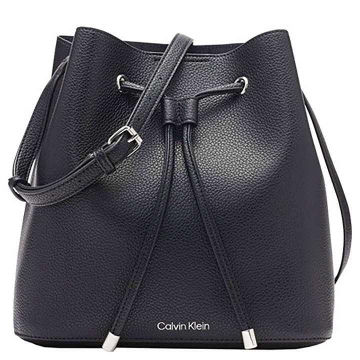 The Gabrianna novelty bucket shoulder bag from Calvin Klein will hold everything you need for everyday use. Made of high-quality vegan leather, it features a drawstring top, front and top zipper pockets with an open middle compartment, 2 interior sip pockets and an interior zip pocket strap. Measures 10.5” x 10” x 6.75”.