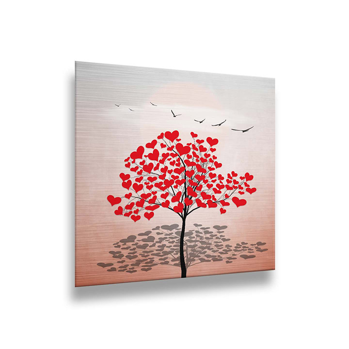 Add a touch of elegance to your living space with "Love Tree Shadow III" by Hal Halli. This stunning graphic art depicts a tree embellished with red hearts as leaves, set against a charming pink and white background with birds flying by. Handcrafted by a skilled artist in the USA, it's the perfect way to add a whimsical charm to your home decor. 24" x 24" Image size.