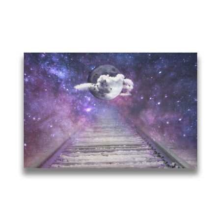 Step into a dreamscape where the earthly meets the ethereal in "Track for the Night Train," a captivating photograph by Hal Halli, proudly printed in the USA. This surreal image invites viewers to embark on an imaginative voyage along a mystical railway that seems to lead directly into the cosmos. Perfect for dreamers and stargazers, this artwork will inspire and elevate any space with its otherworldly charm. 20" x 30" Image size.