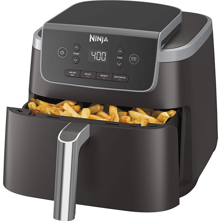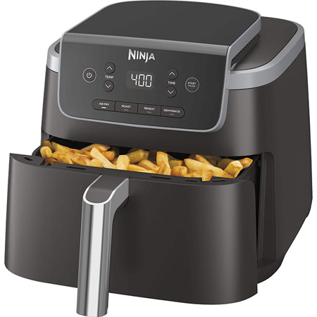 Meet the Ninja Air Fryer Pro a fast and easy way to get the perfect crisp with up to 400F of heat. Air Crisp Technology surrounds your favorite foods with superheated air for hot crispy results. With 5 QT capacity cook up to 4 lbs of fries using little to no oil and enjoy your favorite foods guilt-free. With Air Fry Roast Reheat and Dehydrate the options are endless. 4 cooking functions lets you satisfy any craving from crispy snacks to full meals. Then cleanup is a breeze with a nonstick basket and crisper plate.