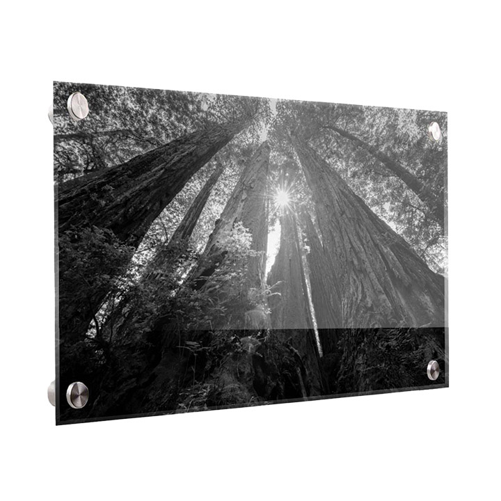 “Among Giants” is a stunning piece of black and white photography by Scott Barlow, capturing the majesty and grandeur of the towering redwood trees in Redwood National Park, California. This modern look on ΒΌ” acrylic art is back printed with UV cured ink, and all images come with silver standoffs and installation instructions. Measures 24” x 36”.