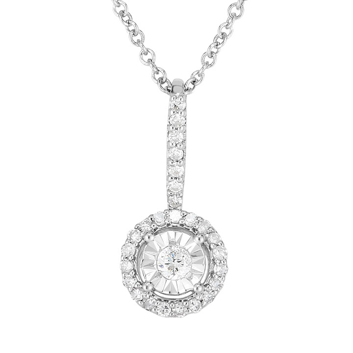 Lend the perfect touch of charisma to any look with this shimmering solitaire diamond pendant necklace with diamond-cut detailing for added sparkle. Fashioned in cool sterling silver, the center diamond is artfully set to enhance the sparkle wrapped in a halo of glistening diamonds. Suspended from an 18” cable chain.