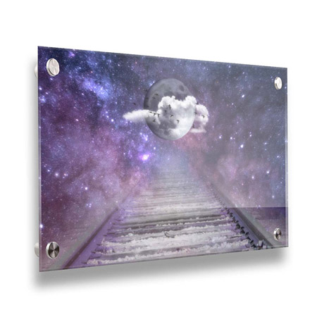 Step into a dreamscape where the earthly meets the ethereal in "Track for the Night Train," a captivating photograph by Hal Halli, proudly printed in the USA. This surreal image invites viewers to embark on an imaginative voyage along a mystical railway that seems to lead directly into the cosmos. Perfect for dreamers and stargazers, this artwork will inspire and elevate any space with its otherworldly charm. 20" x 30" Image size.