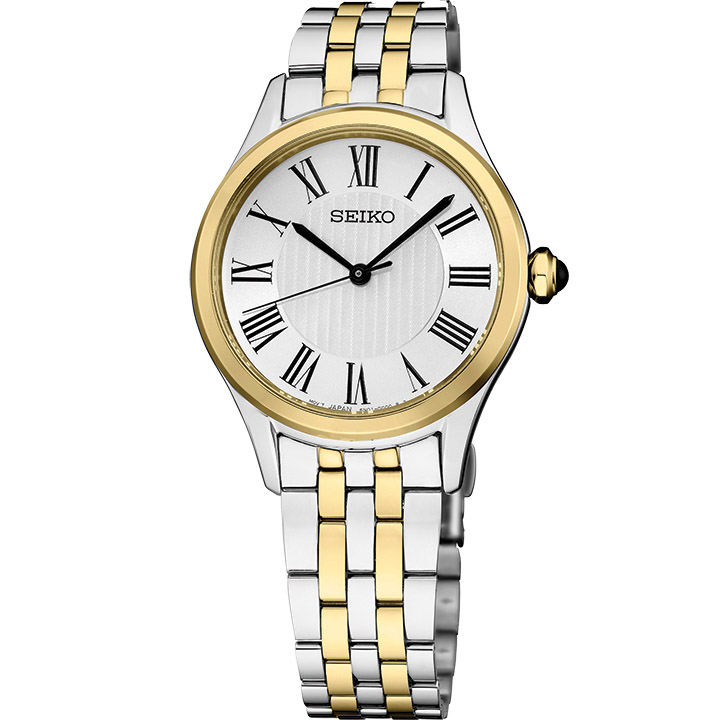 From Seiko's Essentials Collection, this sophisticated watch features patterned white Roman numeral dial with black hands. Crafted of stainless steel with a gold two-tone finish and scratch resistant sapphire crystal, this 29.6mm face watch is an instant classic.