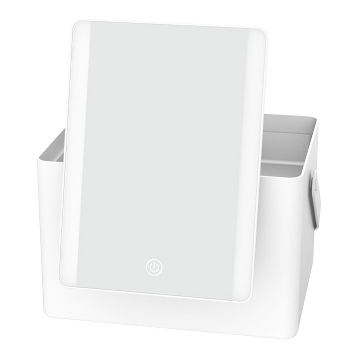 Experience clear energy-efficient illumination with light bulbs that never need to be replaced. 3 Light Settings: Select low medium or high at the touch of a button. 1x Magnification: Apply makeup and style hair with your reflection shown at actual size. Light powered by 4 AAA batteries (NOT included). Includes storage box and removable compartment tray. 2-in-1 Convenience: Storage box doubles as a stand for the mirror. Convenient handle. Compact Dimensions: 6.65" x 9.05" x 5.9".