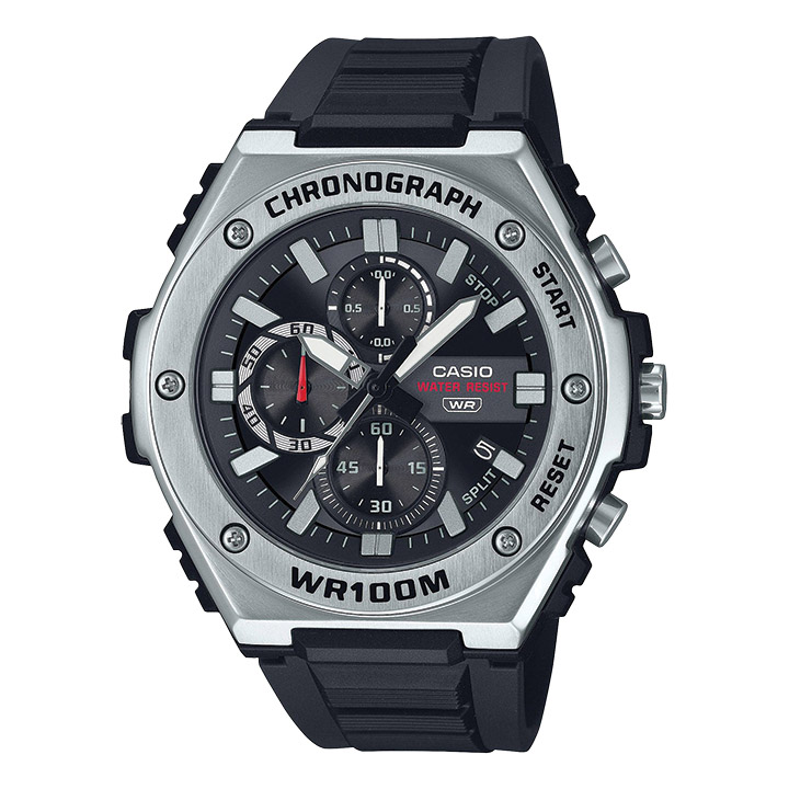 This black unisex sporty analog chronograph watch from Casio has a black resin strap, a black chronograph dial with three hands and a stainless-steel bezel, day of the month display, resin glass dial window, and traditional buckle closure. The chronograph includes a 1/10-second stopwatch, stopwatch with minutes, and stopwatch with seconds. Water resistant to 100M. Accuracy to +/- 20 seconds per month. The case measures 52.3mm x 50.9mm x 14.3mm.
