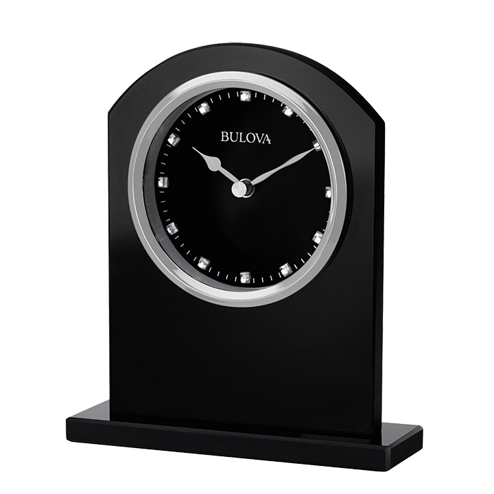 The Ebony Crystal tabletop clock is a contemporary clock crafted of heavy black glass with a polished silver-tone bezel, glass lens, and glossy ebony dial accented with crystalline baguettes at each hour marker. It requires one AA battery (not included) and includes a 3.25” x 0.75” engraving plate.