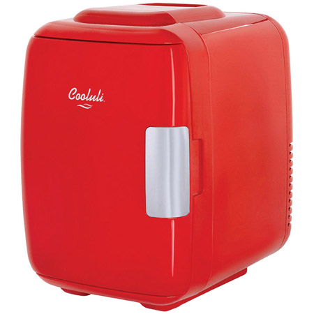 The Cooluli Classic red 4 liter mini fridge is the ultimate 2-in-1 cooler and warmer. You can store food, drinks, medications, and other essentials at the right temperature thanks to EcoMax technology, a unique cooling system that makes the thermos-electric units quiet yet powerful and essential. It cools down 35F to 40F below ambient temperature and warms up to 149F.