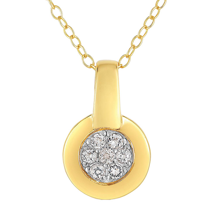This is a classic, timeless pendant necklace - with a secret. It has the look of a big stone without the massive price tag. Small, brilliant white topaz are bunched together to create the illusion of a larger stone set in high-polished 14K yellow-gold vermeil. The pendant is suspended from an 18” cable chain with a spring-ring clasp.