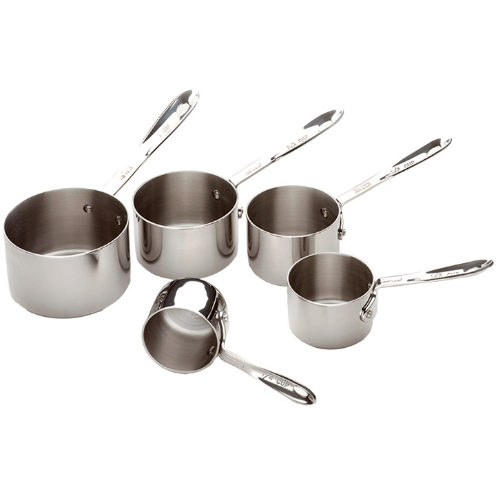 This stainless-steel 5-piece measuring cup set has a streamlined shape that’s designed to easily fit inside bags of flour and sugar. And like the saucepans they were modeled after, they’re made from long-lasting 18/10 stainless steel, have a stylish mirror polished finish, and are fitted with a sturdy handle. The set includes 1/4 cup, 1/3 cup, 1/3 cup, 2/3 cup and 1 cup sizes.