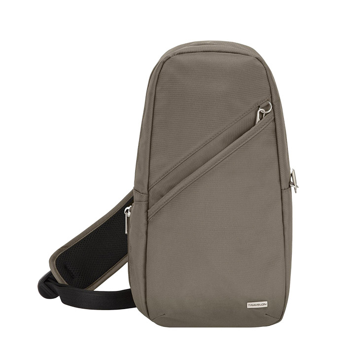 This classic anti-theft sling bag in nutmeg has a main compartment that will hold a 10” tablet, with organizer panel slip pockets and a zippered pocket, as well as a roomy front zipper pocket, rear zippered pocket, and adjustable reversible shoulder strap that’s made of padded air mesh for a cool, comfortable carry. The strap measures 25” to 48” long and the bag itself measures 7” x 14” x 4”.