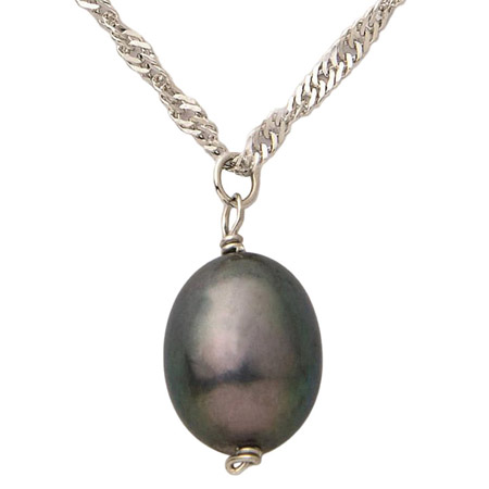 The intrigue and mystery of this black pearl pendant is the finishing touch on this delicate necklace. The 11mm black freshwater teardrop pearl pendant is suspended from an 18” sterling-silver Singapore chain.