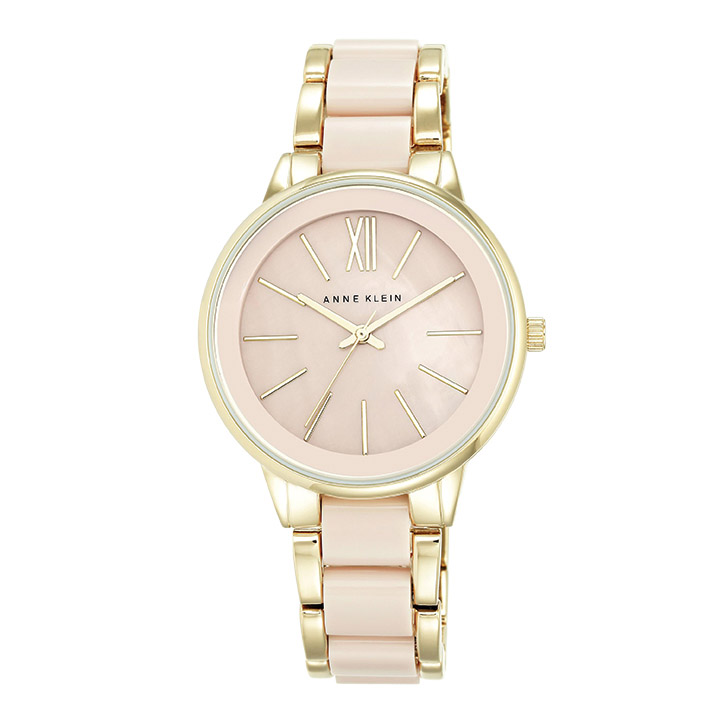 This Anne Klein women’s blush dial bracelet watch is a lovely classic. It has a slightly domed mineral crystal lens, a blush pink mother-of-pearl dial with gold-tone hands and markers, a 37mm case, and a gold-tone adjustable link bracelet with blush pink resin center links. Water resistant to 100 feet.