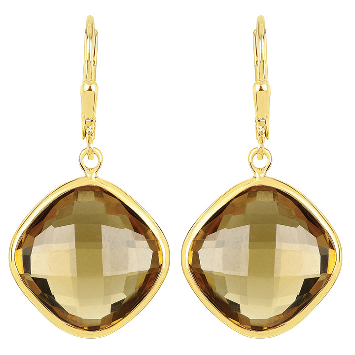The uniquely colored champagne quartz gems of these drop earrings are set in 18k yellow gold over 925 sterling silver.