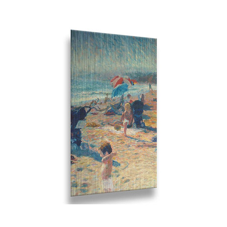 Step into a world of youthful wonder and carefree joy with Robert Blehert's "Babes on the Beach". This charming artwork transports you to a sun-kissed beach, where two young children frolic amidst the sand and surf. Blehert's skillful combination of dense brushstrokes and a soft color palette infuses the scene with a sense of whimsy and nostalgia, capturing the fleeting moments of childhood innocence and adventure. This heart-warming portrayal of summer delight would be perfect for any living room, nursery, or beach house retreat. Get your art printed on a metal. This comes with a backer frame to hold the art off the wall and make installation a breeze. Size is 8"x12"