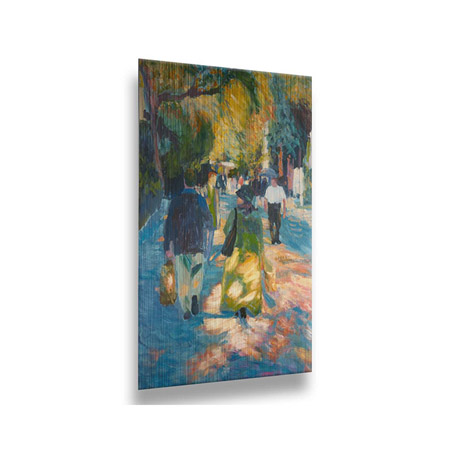 Andante by Robert Blehert is a beautiful painting featuring people strolling down a paved road lined with rows of trees and shrubbery. This beautiful piece exudes a sense of tranquility in the dappled light. Made in the USA with the utmost care and skill. Get your art printed on a metal. This comes with a backer frame to hold the art off the wall and make installation a breeze. Size is 8"x12"