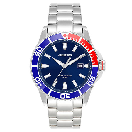 Silver-tone stainless steel case with a ratchet red/navy aluminum bezel and silver printing. Silver-tone stainless steel adjustable bracelet with a fold over buckle with safety clasp. Navy sunray dial with silver-tone applied markers at all hour positions. Calendar at 3 hour within a white printed frame.