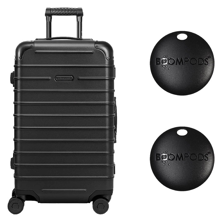 Trips are always more enjoyable when you can bring as much as you want. Our trunk is a large check-in suitcase with a built-in shelving system and unbreakable polycarbonate shell ready for whatever adventure awaits. Kit contains 2 Boomtags which come in black. Features include frictionless 360-degree wheels, TSA approved three-digit lock, one-pinch opening mechanism, ergonomic handle for maximum comfort and control, unbreakable polycarbonate shell and aluminum frame, and cleans up 6 pounds of ocean-bound plastic from coastal communities.