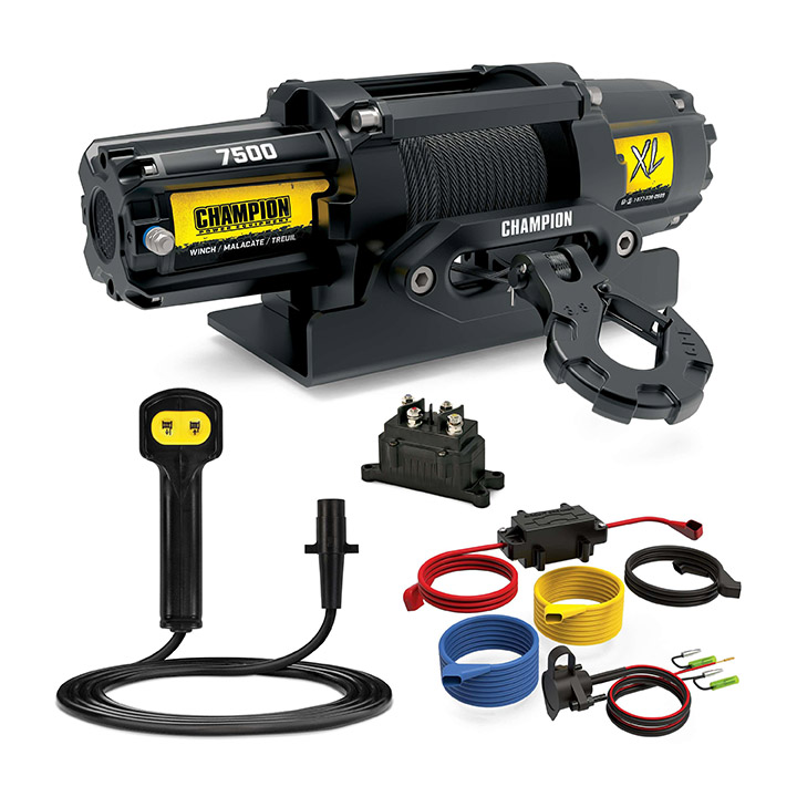 The Champion Power Equipment 7500-lb. UTV Winch includes everything you need to start winching.With a rated line pull of 7500 pounds, mount this winch on your UTV or side by side with the included mounting plate to quickly harness the strength of its 4.3-horsepower (12-volt) DC permanent magnet motor.Made from hi-tech polyethylene, the high flexibility and low weight of synthetic rope prevents kinking, plus it won't fray or curl.Synthetic rope stores less kinetic energy and will not recoil with as much force as steel, and if it breaks, it can be repaired in the field, plus it floats so water recovery is easier. Since it's free of wire splinters or burrs often found in steel rope, there's less chance of injury.Designed with a stainless-steel thimble and protective sleeve, the 55-feet by 9/32-inch synthetic winch rope is guided onto the drum through the fairlead. Featuring a black anodized finish, the lightweight aluminum hawse fairlead is precisely machined to maximize the life of the synthetic rope.Features a positive battery cable with a built-in, self-resetting circuit breaker designed to protect the winch from an overweight pull or long full weight pull failures.The three-stage planetary gear system along with the handlebar-mounted remote control and free-spooling clutch offer excellent control while winching.With a gear reduction ratio of 256:1, the winch boasts a line speed of 3.3 feet per minute with a full load, and 11.1 feet per minute with no load.The drum measures 2.2 by 4.8 inches, and accompanied by the heavy-duty clevis hook and handy strap, this compact and lightweight tool is anything but lightweight when it comes to power.Offering much more than a motor and a spool of rope, the Champion 7500-lb. winch kit is a necessary tool for any situation you might encounter.IP68 Water and Dust Proof Rated, Champion Support and our nationwide network of service centers will back up your purchase with a 2-year limited warranty and FREE lifetime technical support.