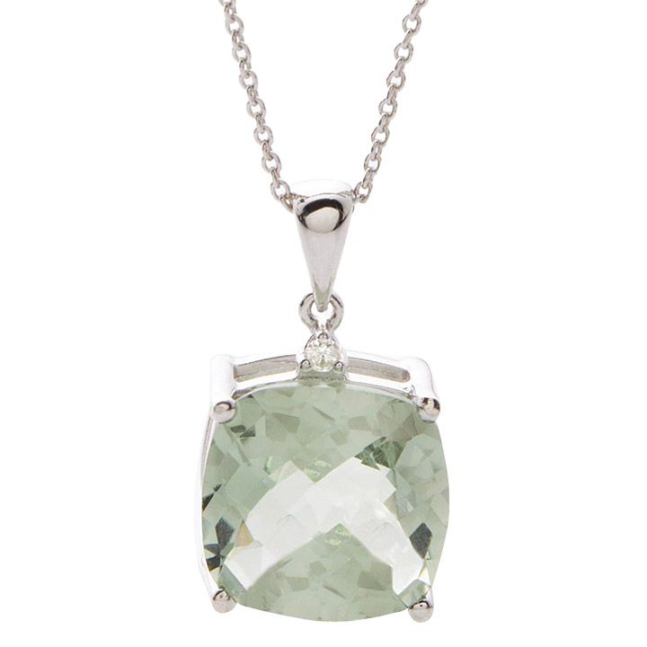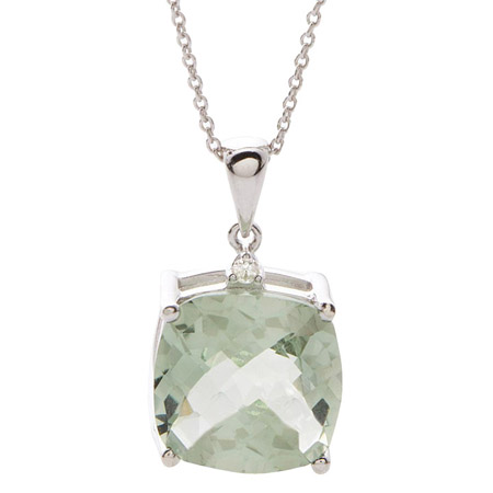 A subtle pop of color makes this necklace stand out from the rest. Crafted in luminous sterling silver, the pendant necklace features a centrally staged cushion-cut 12mm green amethyst and .02-carat round-cut diamond. The stone hangs from an 18” cable chain with a spring-ring clasp.